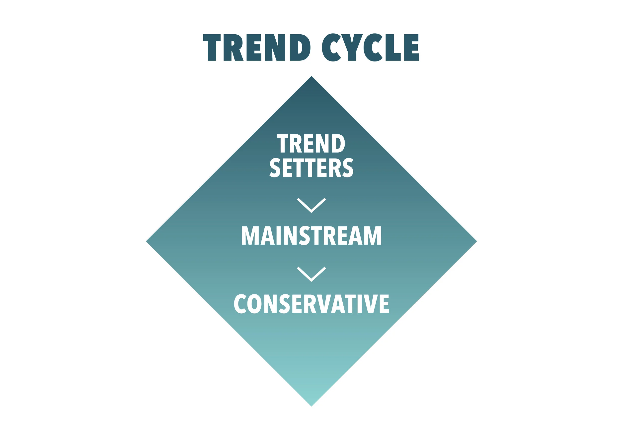 To really simplify the way trends work, they filter through the three main stages of person (or customer): innovators, mainstream and conservatives. This is skipping out a few steps, but it’s an easy way to understand the general evolution. Think about it as a diamond. You’ve got a relatively smaller top and bottom with a wide middle – so fewer innovators and conservatives and a significant chunk of mainstream. It all starts at the top and filters down in time, before starting all over again with a new trend a few seasons later. How long it takes is different in different industries – but for clothing it’s generally 2-3 years.